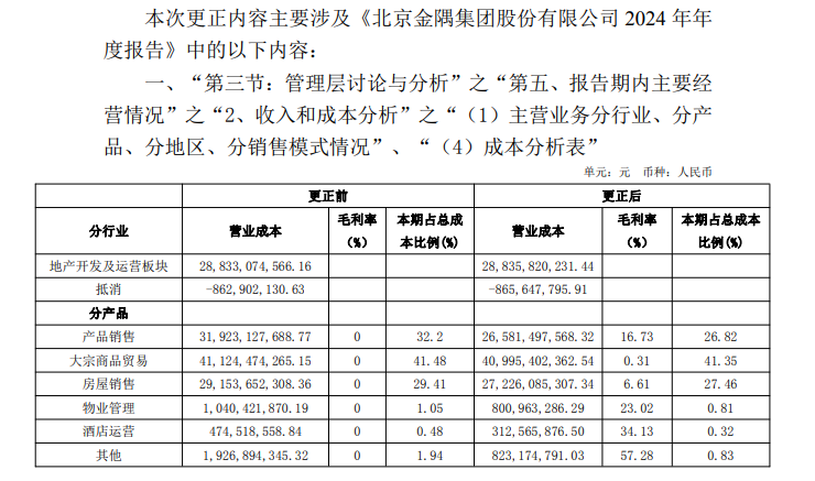 此次对年报进行修订或更正的公司中,有不少和隆基绿能一样,问题出在收入和成本分析表格上。如宏工科技(301662.SZ)最初披露的年报版本中分行业收入同比变动方向有误;大西洋(600558.SH)披露的分地区营业成本、毛利率等数据有误;金隅集团披露的分产品营业成本数据有误等。