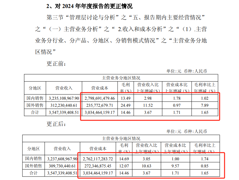 银柿财经对比发现,错误数据集中在主营业务分地区的同比变动数据上,更正后,多个区域的营收和成本变动方向及毛利率增减值发生变化。