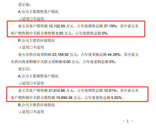 除了收入成本分析表外,“主要销售客户及主要供应商情况”也集中性出现疏漏。如华丰股份(605100.SH)出现前5名客户及供应商列报不准确的情况;吉视传媒(601929.SH)销售客户和供应商数据统计错误;东安动力(600178.SH)供应商数据统计错误等。