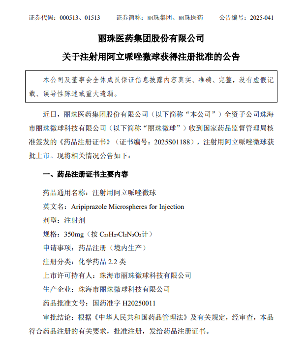 5月9日,丽珠集团(000513.SZ)公告称,公司收到国家药品监督管理局核准签发的《药品注册证书》,注射用阿立哌唑微球获批上市。该药品为丽珠微球自主开发的长效缓释制剂,适用于成人精神分裂症,每月给药一次,可提高用药依从性,有助于降低复发和入院比率。截至公告日,该药品累计直接投入的研发费用约为人民币7,888.75万元。截至公告日,阿立哌唑长效微球制剂仅丽珠微球取得生产批件,全球尚无其他阿立哌唑微球产品上市。