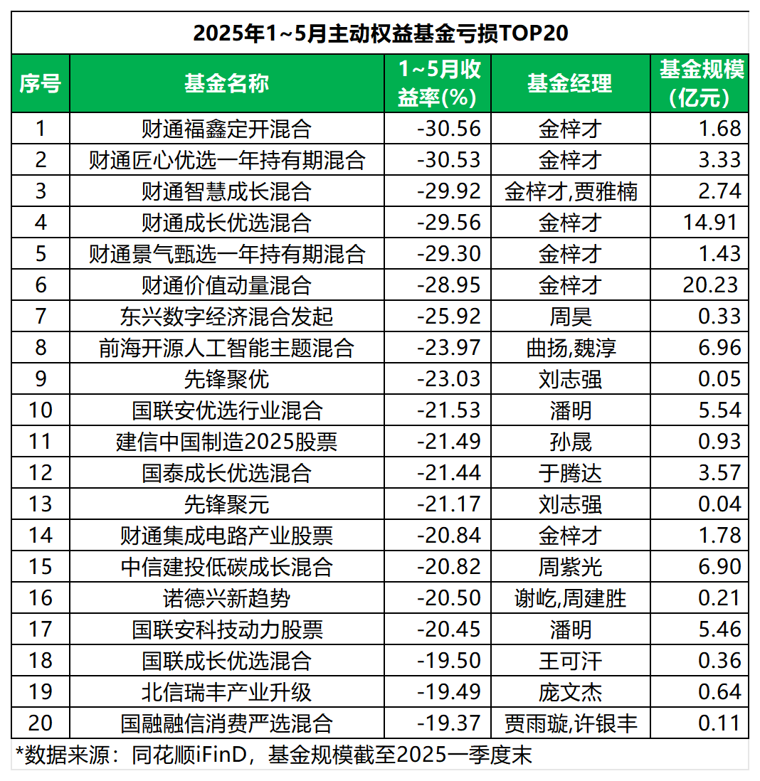 去年斩获主动权益业绩亚军的财通基金金梓才,在管的6只基金,今年前5个月业绩集体垫底,整体亏损30%左右。从一季度末的持仓看,部分原因是金梓才在管多只基金持仓雷同,导致“一损俱损”;另一方面,年内出现择时失误,如2024年四季度,金梓才将万辰集团买成第一大重仓股,并在季报中表示看好:“未来大消费板块主要的超额收益来自于‘新’。”却在今年一季度末将仓位大幅砍至接近清仓,错过了二季度的翻倍大涨。