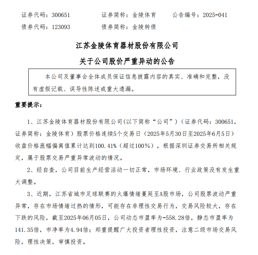 6月5日晚间,金陵体育(300651.SZ)发布股价严重异动的公告,公司股票价格连续5个交易日(2025年5月30日至2025年6月5日)收盘价格涨幅偏离值累计达到100.41%(超过100%),根据深圳证券交易所相关规定,属于股票交易严重异常波动的情况。