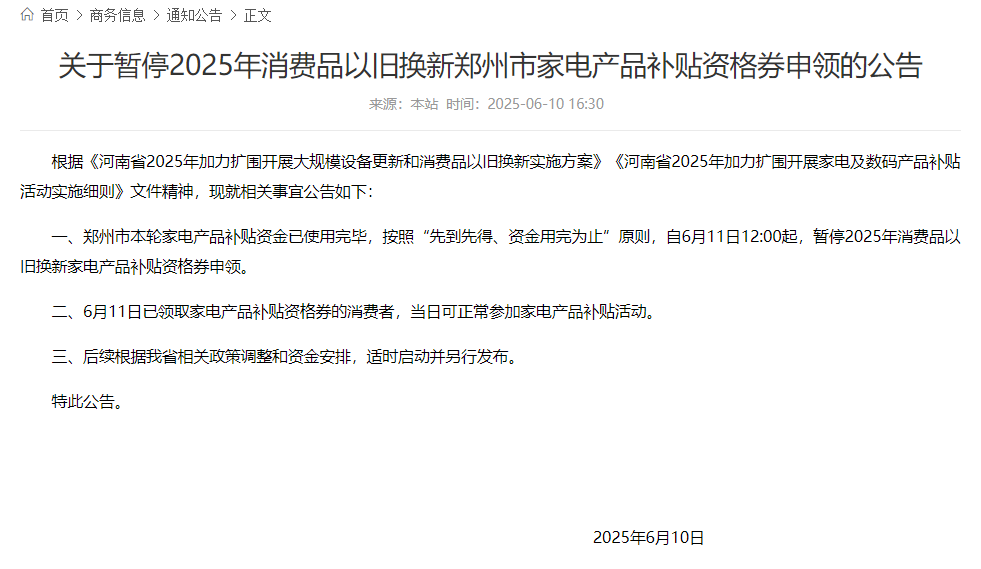 6月10日,郑州市商务局发布公告,暂停2025年消费品以旧换新家电产品补贴资格券申领。公告指出,郑州市本轮家电产品补贴资金已使用完毕,按照“先到先得、资金用完为止”原则,自6月11日12:00起,暂停2025年消费品以旧换新家电产品补贴资格券申领。6月11日已领取家电产品补贴资格券的消费者,当日可正常参加家电产品补贴活动。后续,郑州市将根据河南省相关政策调整和资金安排,适时启动并另行发布。