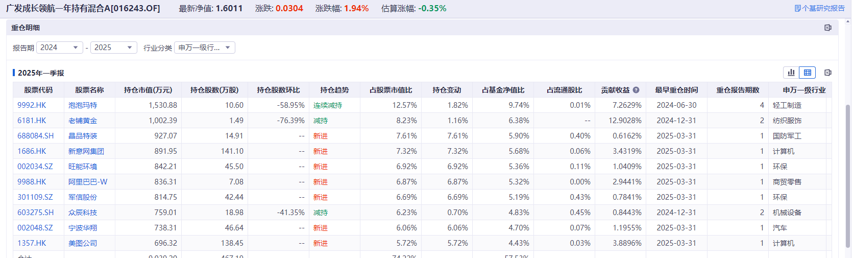 广发成长领航一年持有混合,2024年二季度时首次重仓泡泡玛特,2024年年末首次重仓老铺黄金。截至今年一季度末,泡泡玛特、老铺黄金分别是其第一、第二大重仓股,持股数量分别为10.6万股、1.49万股。管理该基金的吴远怡旗下的另一只产品广发价值核心,也按照同样的节奏重仓了两只个股。