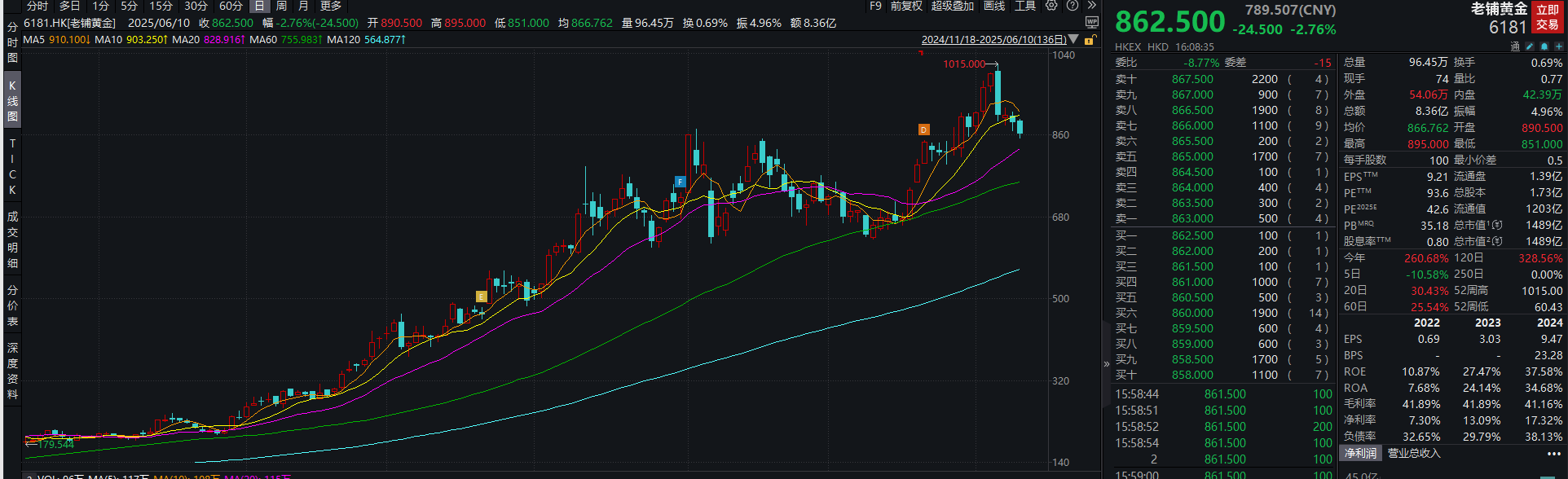 老铺黄金股价自6月4日触及1015港元/股的新高后连续走低,今日收于862.5港元/股。有机构提示,6月28日,老铺黄金将迎来上市后最大规模的限售股解禁,涉及12名股东合计持有的1.43亿股股份,占公司总股本的86.44%,这或许会让老铺黄金的股价持续承压。