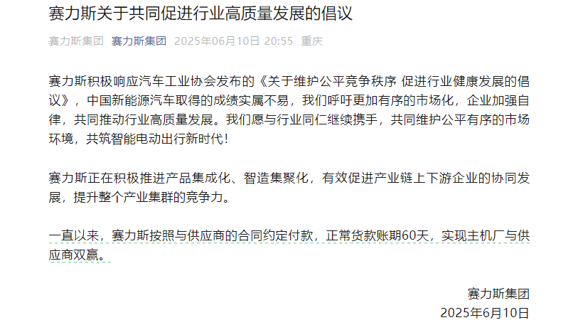 赛力斯在公告中称,正在积极推进产品集成化、智造集聚化,有效促进产业链上下游企业的协同发展,提升整个产业集群的竞争力。一直以来,赛力斯按照与供应商的合同约定付款,正常货款账期60天,实现主机厂与供应商双赢。