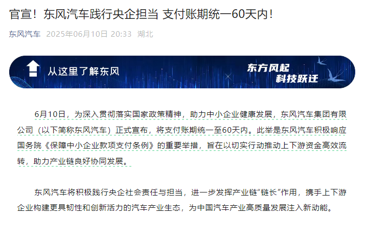 东风汽车则表示,将支付账期统一至60天内是公司积极响应国务院《保障中小企业款项支付条例》的重要举措,旨在以切实行动推动上下游资金高效流转,助力产业链良好协同发展。