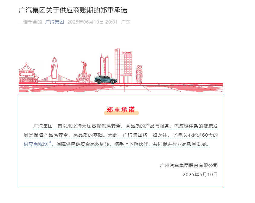 广汽集团表示,将一如既往,坚持以不超过60天的供应商账期,保障供应链资金高效周转,携手上下游伙伴,共同促进行业高质量发展。
