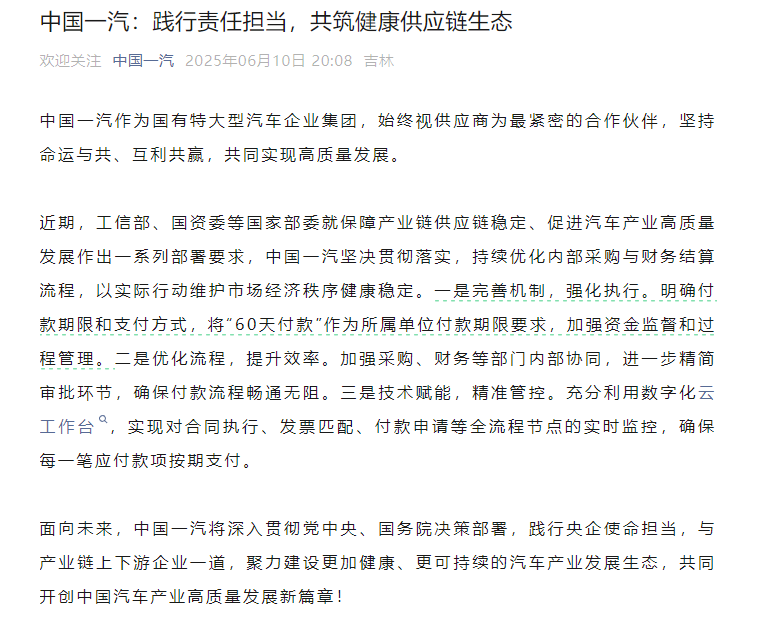 中国一汽在公告中指出,近期,工信部、国资委等国家部委就保障产业链供应链稳定、促进汽车产业高质量发展作出一系列部署要求,中国一汽坚决贯彻落实,持续优化内部采购与财务结算流程,以实际行动维护市场经济秩序健康稳定。一是完善机制,强化执行。明确付款期限和支付方式,将“60天付款”作为所属单位付款期限要求,加强资金监督和过程管理。二是优化流程,提升效率。加强采购、财务等部门内部协同,进一步精简审批环节,确保付款流程畅通无阻。三是技术赋能,精准管控。充分利用数字化云工作台,实现对合同执行、发票匹配、付款申请等全流程节点的实时监控,确保每一笔应付款项按期支付。