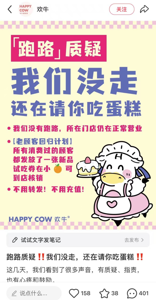 看到“欢牛蛋糕屋”如今的情形,不少老顾客、加盟商心情复杂,他们觉得自己的信任被辜负了。就在一周前的6月8日,欢牛蛋糕屋还下场辟谣称“我们没有跑路,所有门店仍在正常营业”,并给老顾客发放了新品试吃券。