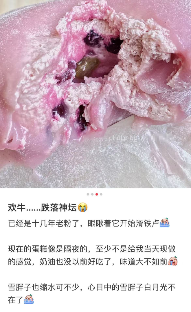 像大家耳熟能详的豆乳盒子、雪胖子这些还是在十年前推出的。欢牛产品的品质也受到了质疑,这两年有网友在社交平台上吐槽称豆乳盒子系列尺寸缩水,还有蛋糕、雪媚娘等产品的品控也比不上此前几年。