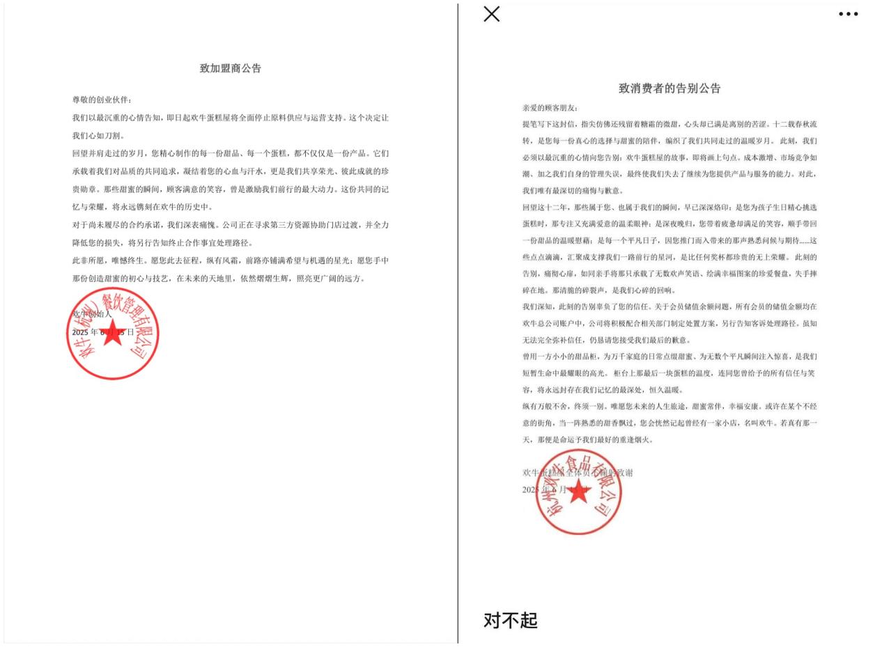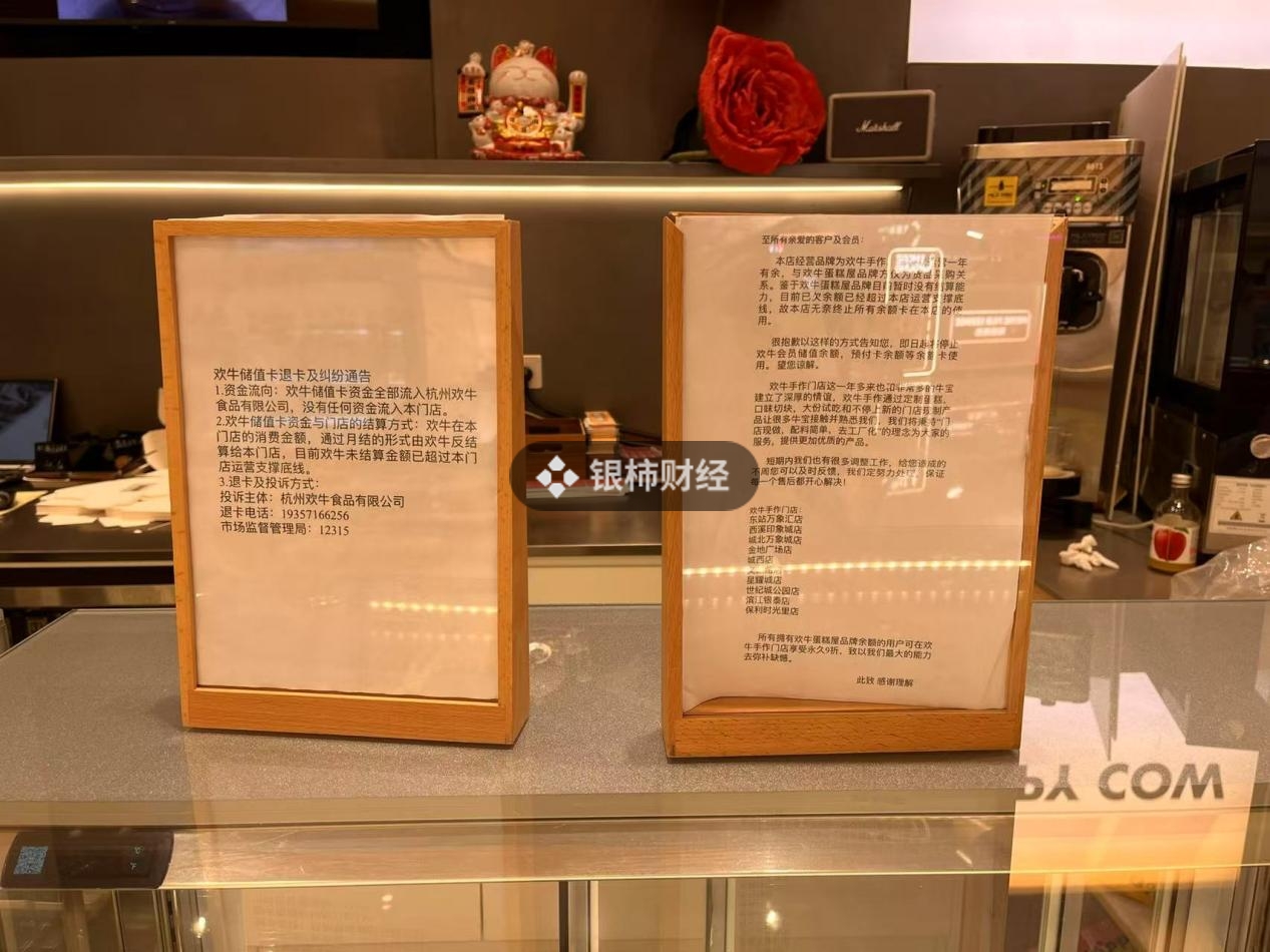 部分不甘心的门店开始自救。银柿财经注意到,多家门店张贴的告示强调称,“我们是独立运营的主体,欢牛是门店部分产品的供应商,倒的是品牌,不是我们”,“生日蛋糕定制如常,门店新鲜制作”。