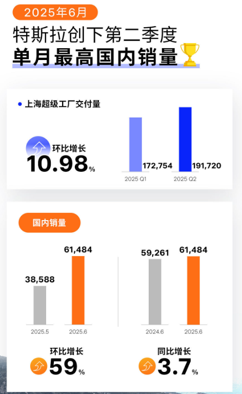 据乘联会最新数据显示,特斯拉上海超级工厂第二季度交付量为19.1万辆,较一季度环比增长10.98%;其中6月国内销量为6.1万辆,环比上涨59%,同比上涨3.7%,创下二季度单月最高国内销量。