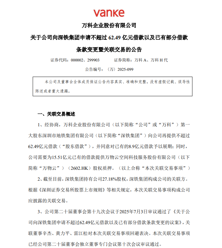 7月3日,万科A(000002.SZ)公告称,公司向第一大股东深铁集团申请不超过62.49亿元借款,用于偿还公开市场发行的债券本金与利息,借款期限不超过3年,利率为每笔借款提款日前一工作日全国银行间同业拆借中心公布的1年期贷款市场报价利率(LPR)减66个基点。同时,公司同意为15.51亿元已有借款提供万物云股权质押。此外,深铁集团同意对公司8.9亿元已有借款展期至2025年12月31日。截至目前,深铁集团持有公司27.18%股权,深铁集团构成公司的关联方。这些交易构成关联交易,已获公司董事会审议通过。