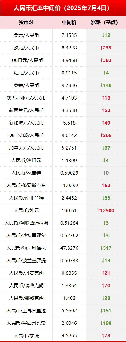 7月4日人民币对美元中间价调贬12个基点 财闻 2025-07-04 11:53:33 7月4日,人民币对美元中间价调贬12个基点,报7.1535,上一交易日中间价7.1523。 2025年7月4日,中国人民银行授权中国外汇交易中心公布银行间外汇市场人民币汇率中间价。具体如下: