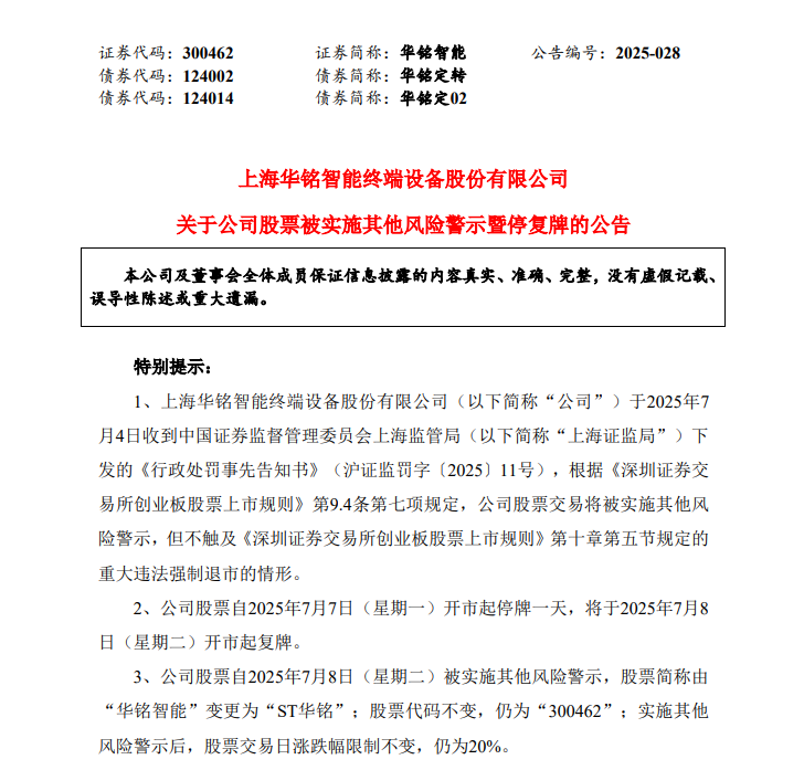 7月4日,华铭智能(300462.SZ)发布公告称,公司股票自2025年7月7日(星期一)开市起停牌一天,将于2025年7月8日(星期二)开市起复牌。公司股票自2025年7月8日(星期二)起被实施其他风险警示,股票简称由“华铭智能”变更为“ST华铭”,股票代码不变,仍为“300462”,实施其他风险警示后股票交易日涨跌幅限制仍为20%。