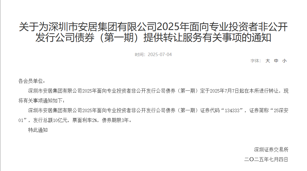 深交所7月4日公告,深圳市安居集团有限公司2025年面向专业投资者非公开发行的公司债券(第一期)将于2025年7月7日起在该所进行转让。该期债券证券代码为“134333”,证券简称“25深安01”,发行总额达到10亿元人民币,票面利率设定为2%,债券期限为3年。