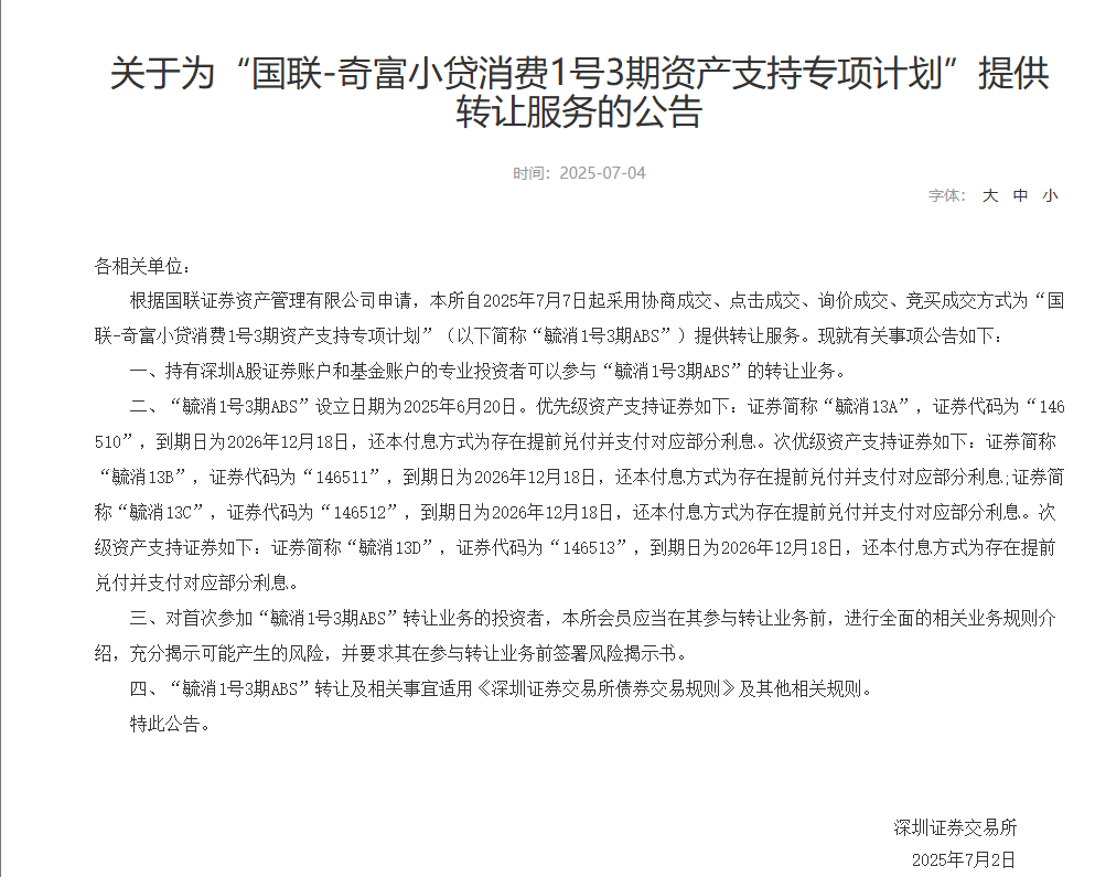 据深交所公告,自7月7日起,将为国联证券资产管理有限公司申请的“国联-奇富小贷消费1号3期资产支持专项计划”(简称“毓消1号3期ABS”)提供协商成交、点击成交、询价成交、竞买成交等多种转让服务。该计划成立于2025年6月20日,包含优先级、次优级和次级资产支持证券,到期日均为2026年12月18日,均存在提前兑付并支付对应部分利息的可能性。深交所要求首次参与该ABS转让业务的投资者需签署风险揭示书,以充分了解相关业务规则和潜在风险。所有转让及相关事宜将遵循《深圳证券交易所债券交易规则》及其他相关规则。