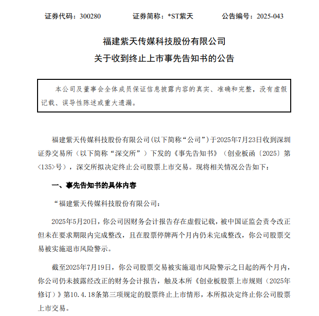 7月23日,*ST紫天(300280.SZ)晚间公告,公司当日收到深交所下发的《事先告知书》,深交所拟决定终止公司股票上市交易。公司股票已于2025年7月21日起停牌。根据《深圳证券交易所创业板股票上市规则》第10.4.21条之规定,公司收到终止上市事先告知书后,可以根据规定申请听证、提出陈述和申辩。公司未在规定期限内提出听证申请的,深圳证券交易所上市委员会在陈述和申辩提交期限届满后十五个交易日内,就是否终止公司股票上市事宜进行审议,作出独立的专业判断并形成审议意见;公司在规定期限内提出听证申请的,深圳证券交易所上市委员会在听证程序结束后十五个交易日内形成上述审议意见。深圳证券交易所根据上市委员会的审议意见,作出是否终止公司股票上市的决定。