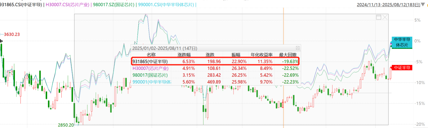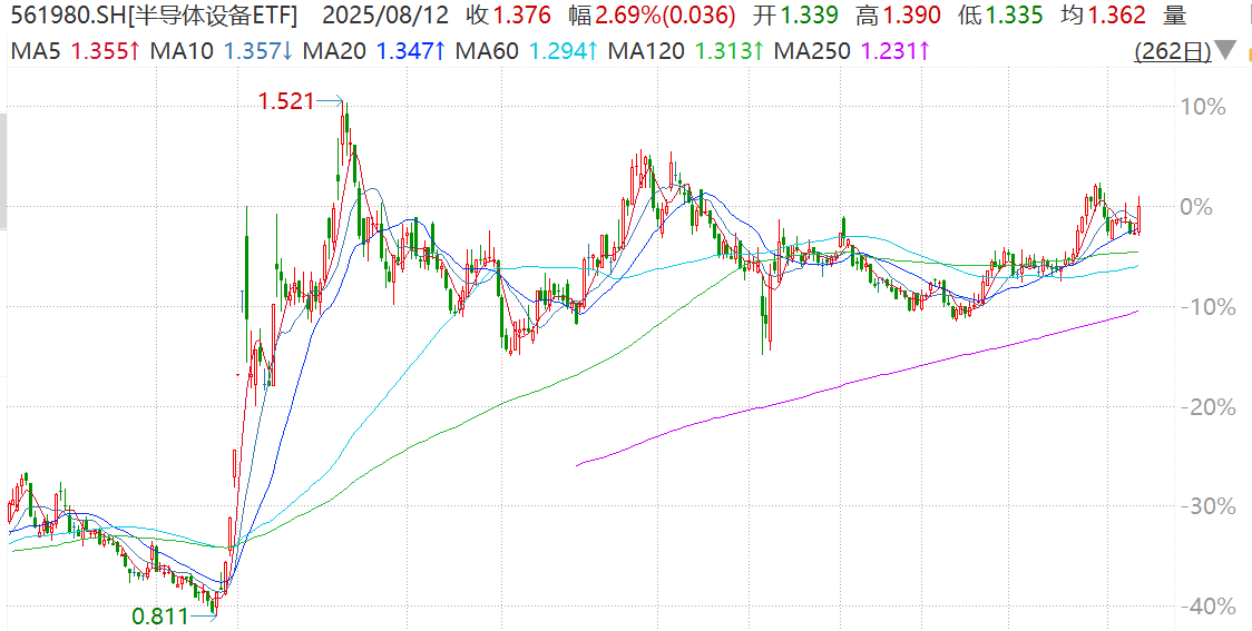 今年以来截至8月11日,半导体设备ETF(561980)跟踪的中证半导指数累涨6.53%,领跑同类指数,寒武纪权重占比达8.19%,“寒王”权重在同类型指数中相对较高。