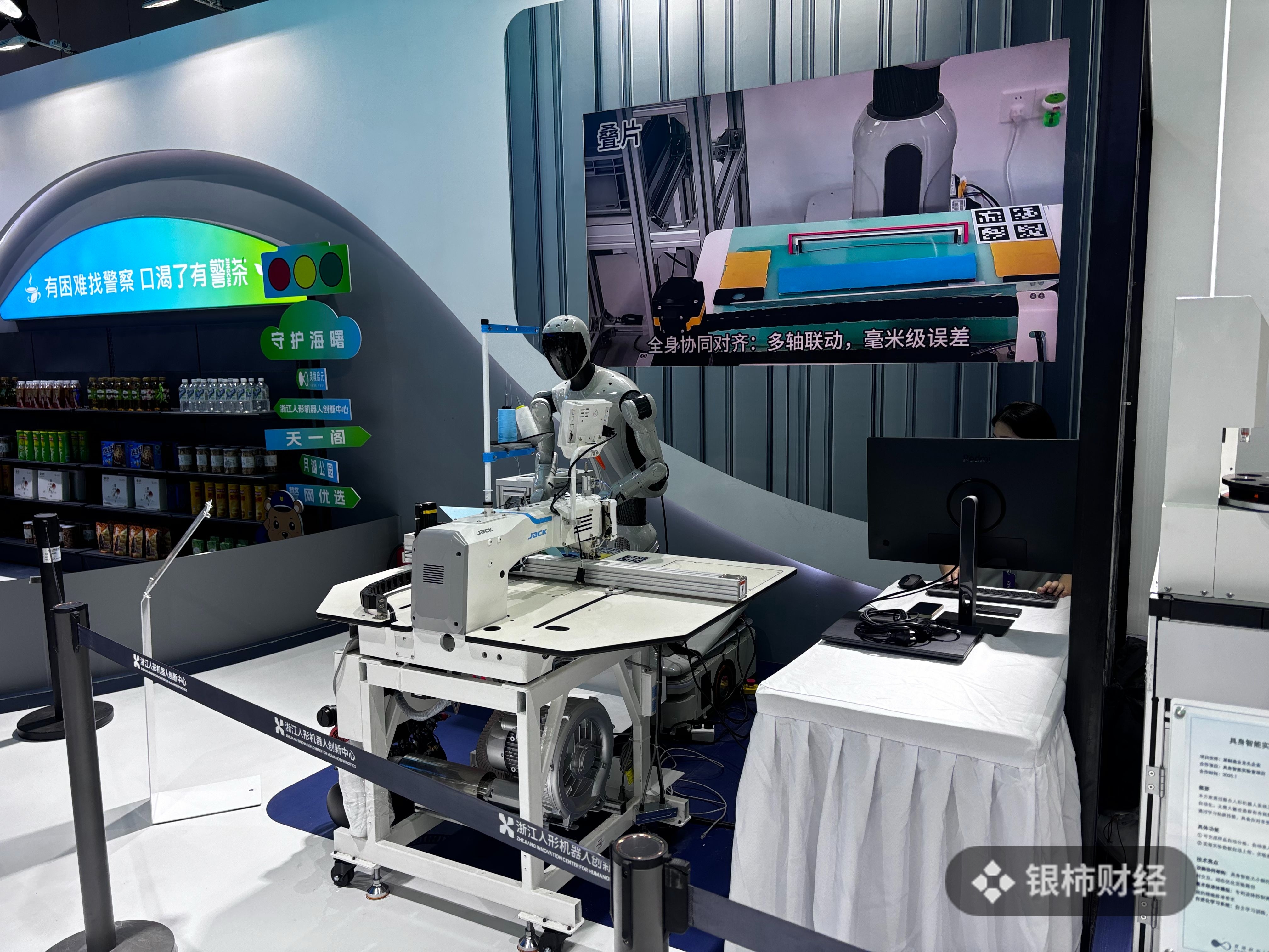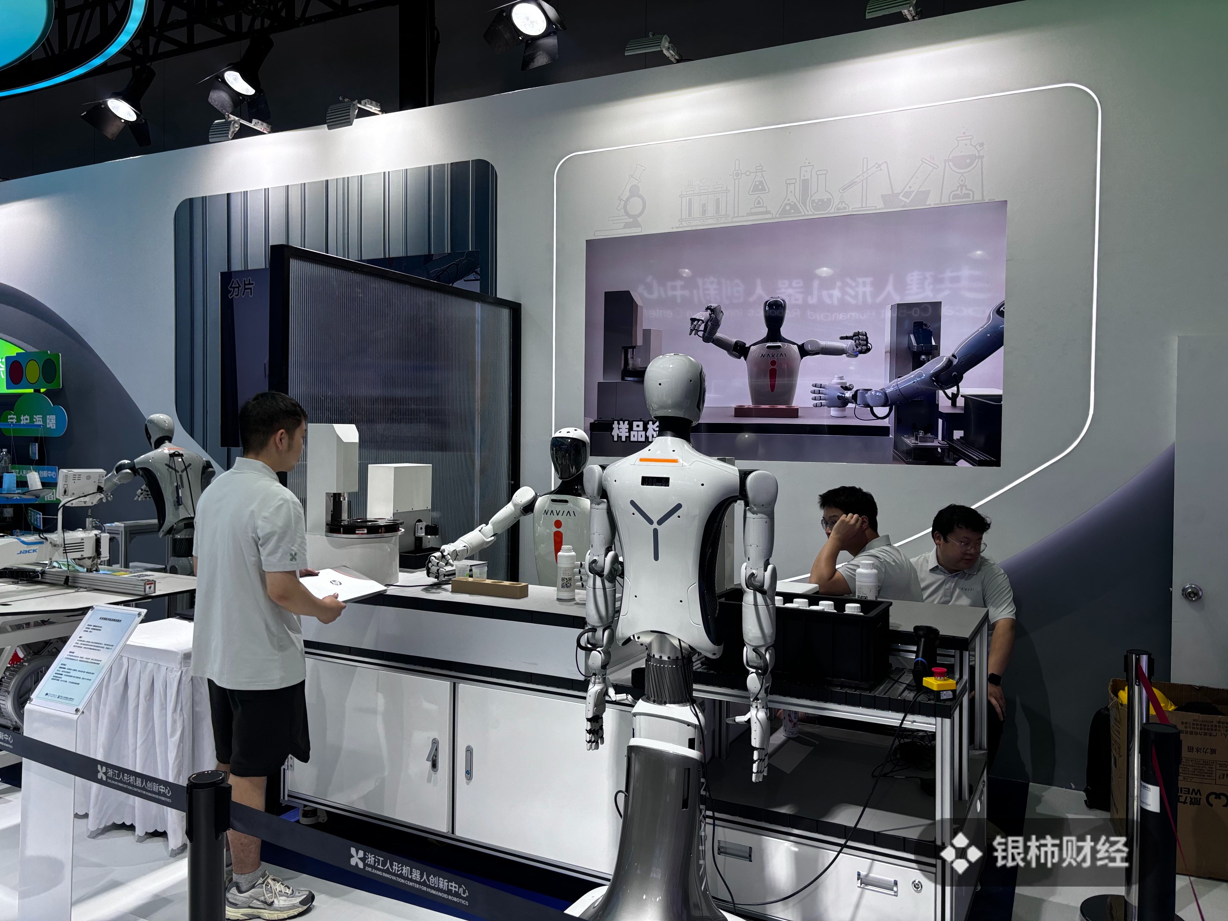 在WRC展馆,创新中心的展位被分为样品检测区、纺织服装区、商超零售区等场景,三台领航者2号展示各自所长,正在勤劳地“工作”。