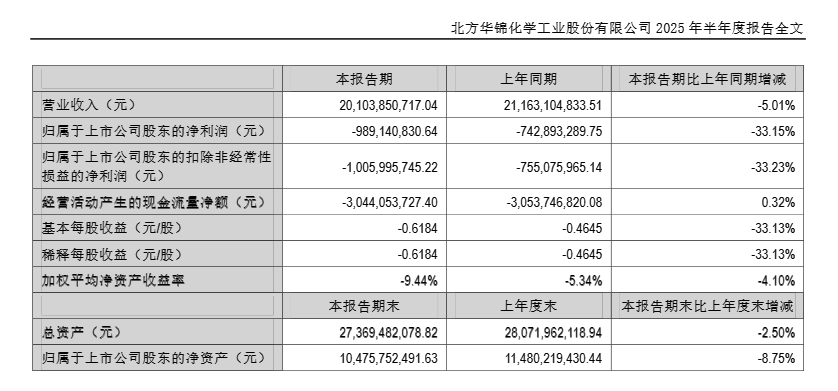 8月12日晚,华锦股份(000059.SZ)发布半年报,上半年营业收入201.04亿元,同比减少5.01%;归属于母公司股东的净利润净亏损9.89亿元,与上年同期净亏损7.43亿元相比亏损扩大。