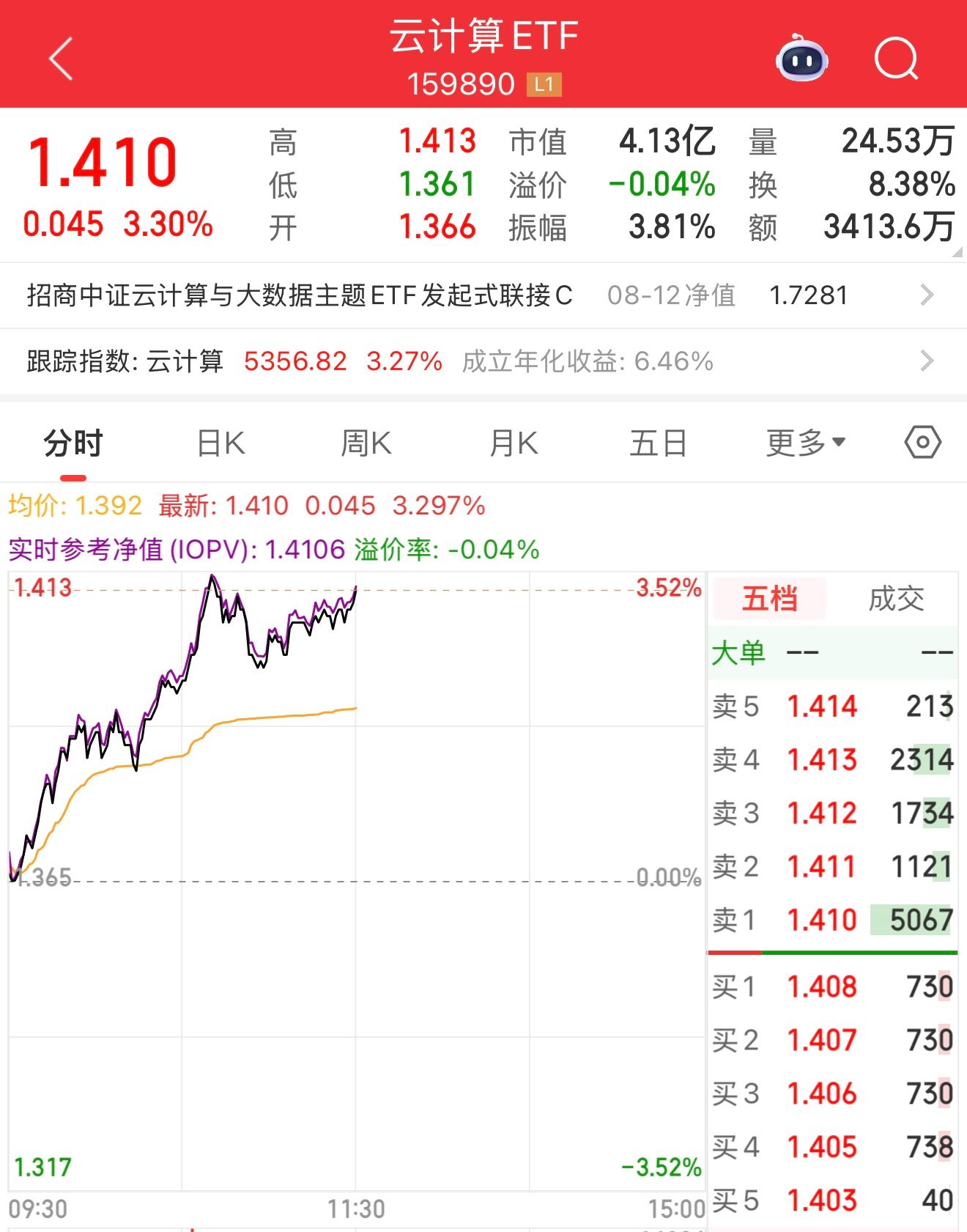 8月13日,两市延续慢牛氛围,上证指数突破3674高点创2021年以来新高,盘面上光模块、光通信、光芯片概念助力大盘刷新新高。市场代表性的云计算ETF(159890)早盘大涨3.30%,成交额超3000万元。