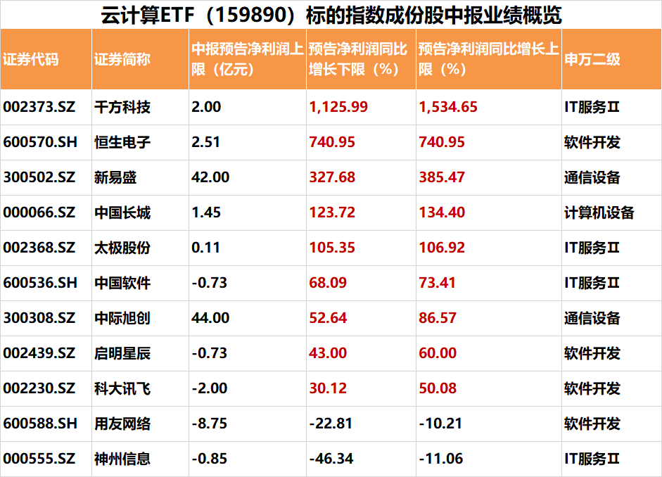 无独有偶,从云计算ETF(159890)成分股中报表现,整个算力产业链业绩持续兑现中。从成分股中报业绩看,千方科技中报净利润同比增幅超10倍,恒生电子则超7倍,中国长城、太极股份两股中报净利润均同比翻倍增长。此外中国软件、中际旭创、启明星辰、科大讯飞等股净利润预告增幅均在50%以上。