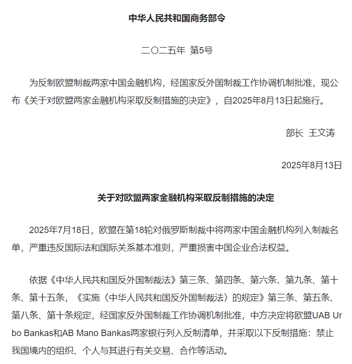 据商务部网站,为反制欧盟制裁两家中国金融机构,经国家反外国制裁工作协调机制批准,现公布《关于对欧盟两家金融机构采取反制措施的决定》,自2025年8月13日起施行。