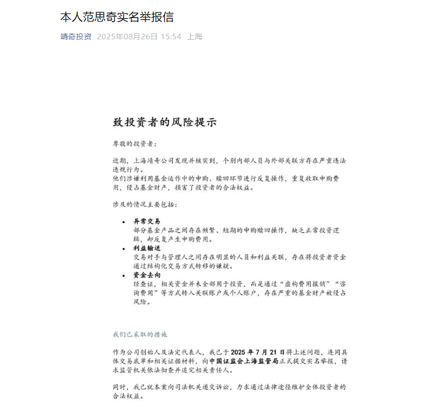 8月26日,量化私募靖奇投资通过其微信公众号发布《致投资者的风险提示》:近期,上海靖奇公司发现并核实到,个别内部人员与外部关联方存在严重违法违规行为。他们涉嫌利用基金运作中的申购、赎回环节进行反复操作,重复收取申购费用,侵占基金财产,损害了投资者的合法权益。该公司表示,根据初步掌握的证据,本次异常交易涉及乐金尚峰1号私募证券投资基金等四只产品。