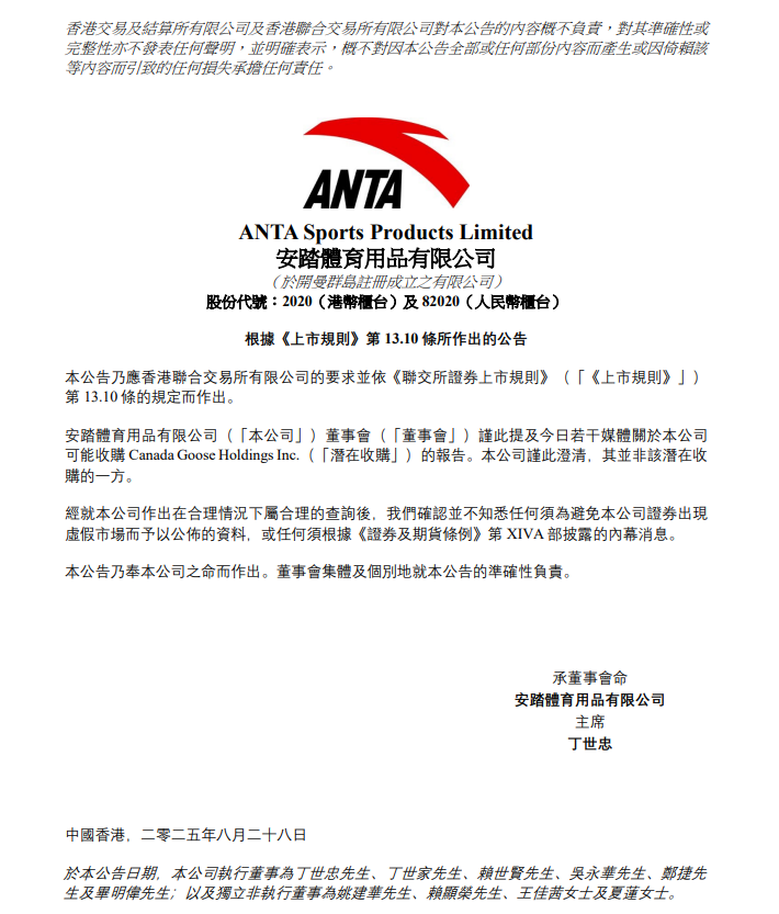 8月28日,安踏体育在港交所公告,谨此提及今日若干媒体关于本公司可能收购加拿大鹅控股有限公司的报告,本公司谨此澄清,其并非该潜在收购的一方。