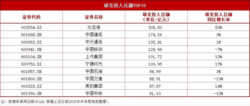 研发投入反映上市公司对科技创新重视程度,是观测其未来成长动力的“先行指标”。今年上半年,比亚迪(002594.SZ)以308.80亿元的研发投入居于5424家上市公司中“断层第一”位置,约为第二名中国建筑(601668.SH)174.26亿元的1.8倍,同时,比亚迪研发投入同比增速高达53%。
