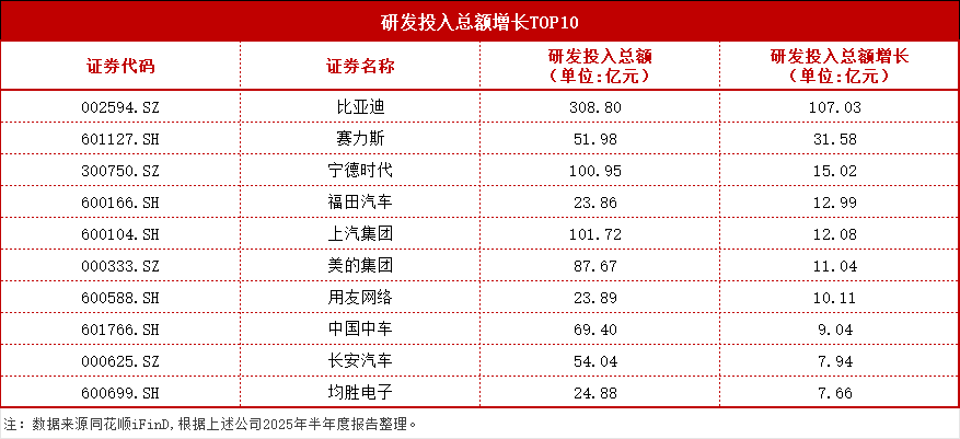 而研发投入增长方面,谁又在“加速冲刺”?比亚迪以同比增长107.03亿元成为上半年增量冠军,该增长额与宁德时代上半年研发投入总额相当。赛力斯(601127.SH)则以上半年研发投入增量31.58亿元紧随其后,体现出“基数小、增幅大”特征。此外,增量10亿级的公司中,还有宁德时代(300750.SZ)、福田汽车(600166.SH)、上汽集团(600104.SH)、美的集团(000333.SZ)、用友网络(600588.SH)等,分别同比增加15.02亿元、12.99亿元、12.08亿元、11.04亿元、10.11亿元。