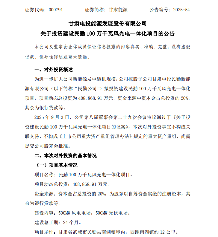 9月3日,甘肃能源(000791.SZ)公告称,公司控股子公司甘肃电投民勤新能源有限公司拟投资建设民勤100万千瓦风光电一体化项目,项目动态总投资为40.89亿元,资金来源中资本金占总投资的20%,其余为银行贷款等。该项目预计风电项目年平均上网电量为10.99亿千瓦时,光伏项目年平均发电量为10.15亿千瓦时。项目建设总工期为24个月,场址位于甘肃省武威市民勤县南湖镇境内。