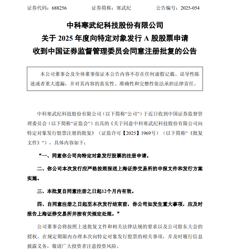 9月9日,寒武纪-U(688256.SH)公告称,公司于近日收到证监会出具的《关于同意中科寒武纪科技股份有限公司向特定对象发行股票注册的批复》。批复同意公司向特定对象发行股票的注册申请,有效期为12个月。公司将按照相关法律法规和批复文件的要求,在规定期限内办理本次向特定对象发行股票的相关事项,并及时履行信息披露义务。