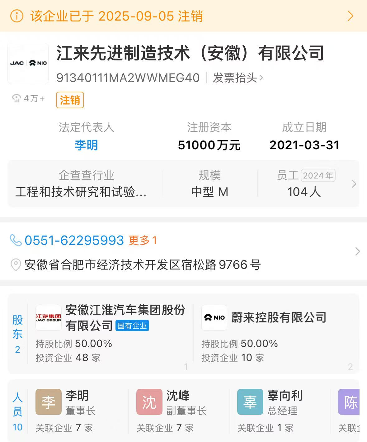 企查查工商信息显示,蔚来与江淮汽车的合资公司——江来先进制造技术(安徽)有限公司登记状态已由存续变更为注销。