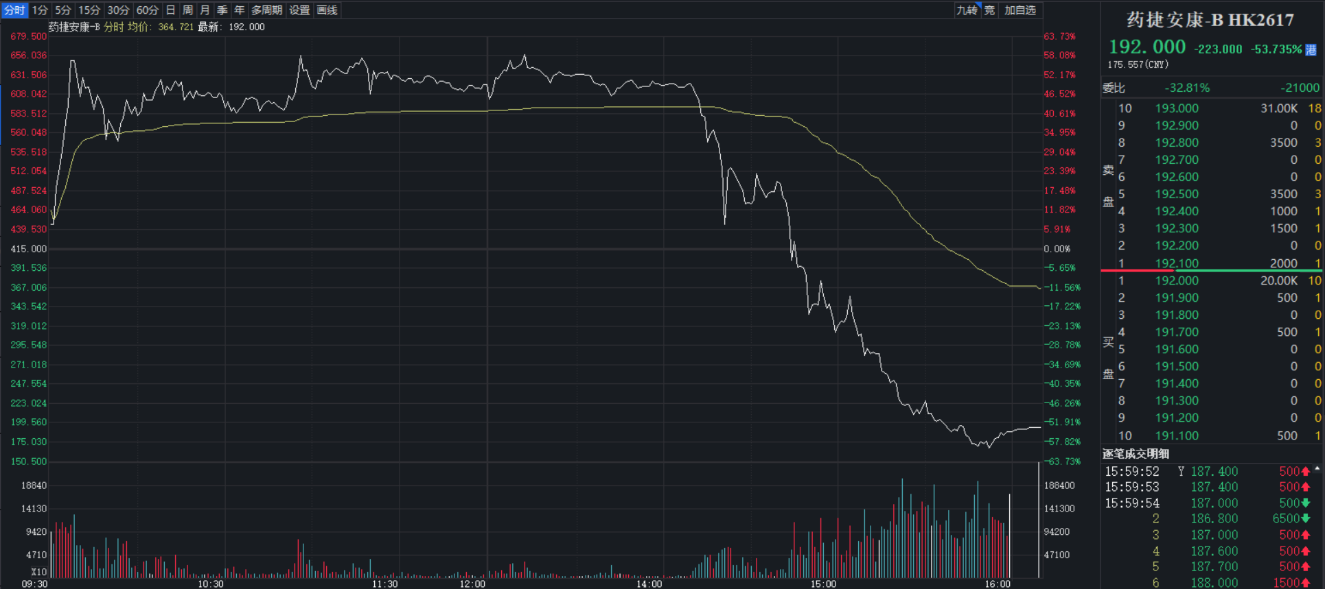 9月16日,港股市场创新药上演过山车一幕,早盘最高摸至679.5港元/股的药捷安康-B(02617.HK)在午后2点10分开始疯狂跳水,股价单边下跌毫无抵抗,最低下探至165.0港元/股,日内股价一度“打25折”,最终收盘定于192港元/股,收跌53.73%,当日成交额45.43亿港元,而换手率仅为4.13%。