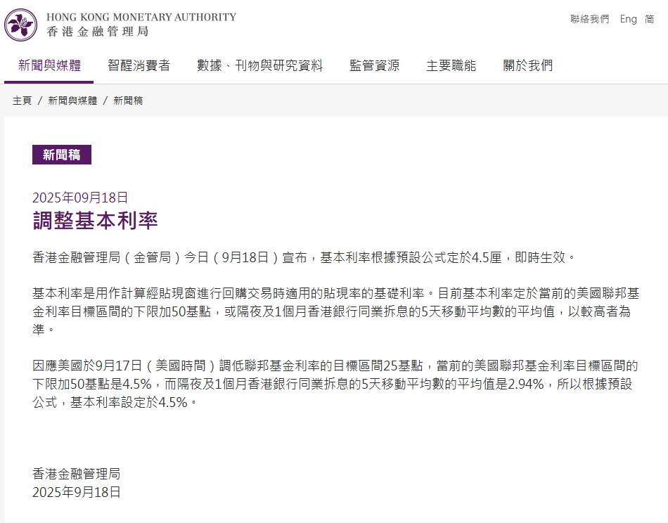 香港金管局表示,因应美国于9月17日(美国时间)调低联邦基金利率的目标区间25基点,当前的美国联邦基金利率目标区间的下限加50基点是4.5%,而隔夜及1个月香港银行同业拆息的5天移动平均数的平均值是2.94%,所以根据预设公式,基本利率设定于4.5%。