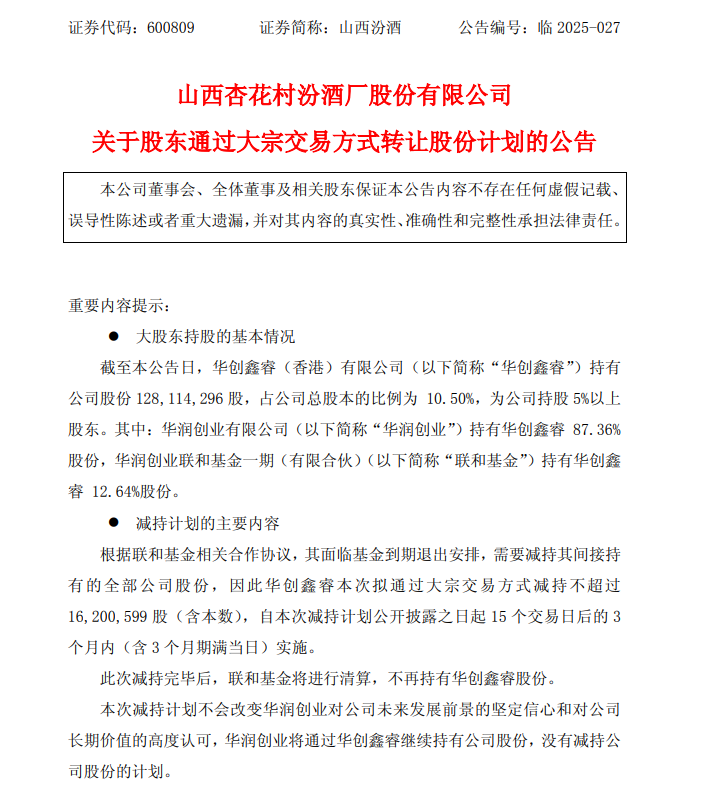 9月21日,山西汾酒(600809.SH)公告称,根据联和基金相关合作协议,其面临基金到期退出安排,需要减持其间接持有的全部公司股份,因此持股5%以上股东华创鑫睿本次拟通过大宗交易方式减持不超过1620万股(含本数),计划减持比例不超过1.33%;自本次减持计划公开披露之日起15个交易日后的3个月内(含3个月期满当日)实施。
