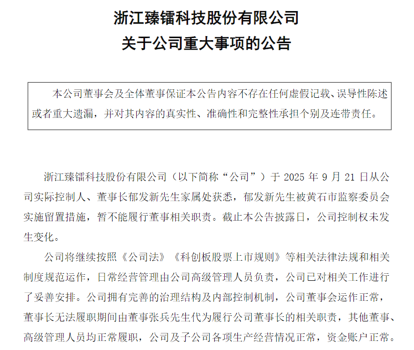 9月22日,臻镭科技(688270.SH)开盘大跌,当日报收60.77元/股,跌幅12.56%。此前,臻镭科技公告,于9月21日从公司实际控制人、董事长郁发新家属处获悉,郁发新被黄石市监察委员会实施留置措施,暂不能履行董事相关职责。截至9月21日,公司控制权未发生变化。