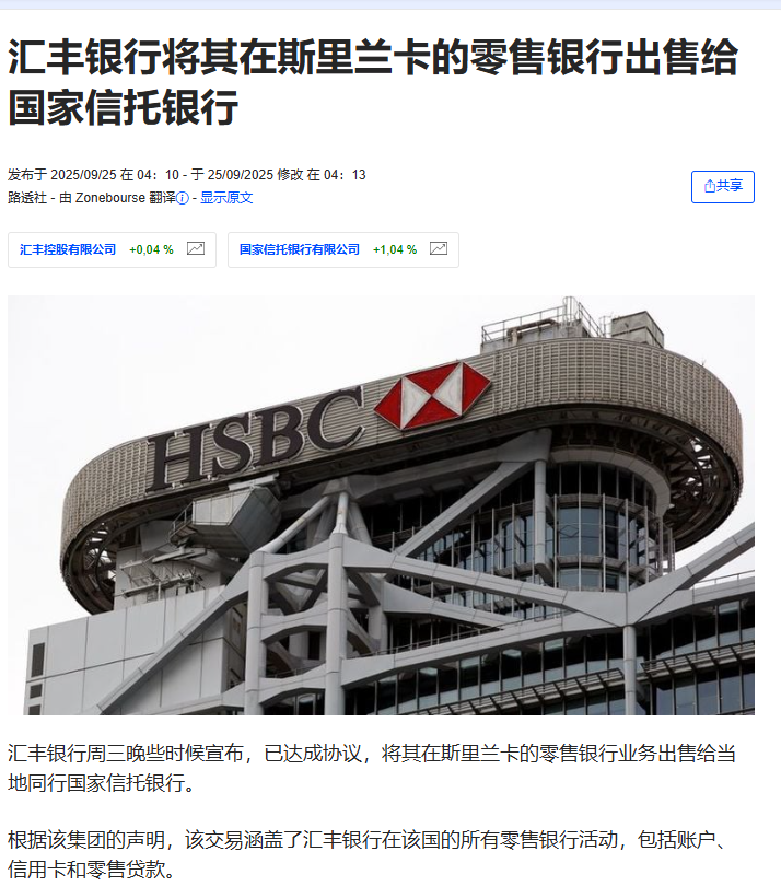 据路透社9月25日报道,汇丰银行(HSBC)宣布,已同意将其在斯里兰卡的零售银行业务出售给当地同行国家信托银行(Nations Trust Bank)。