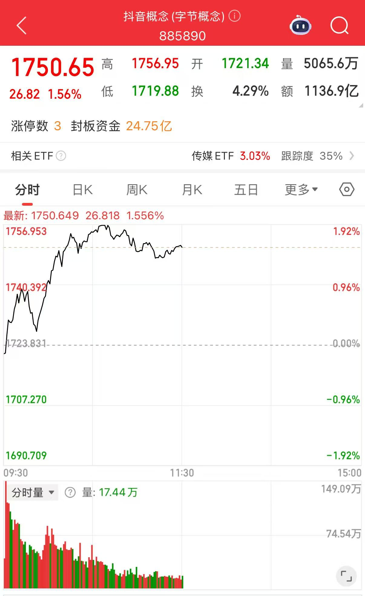 今日盘中,字节跳动概念股集体走强,抖音概念指数(代码:885890)大幅拉升,截至发稿时报1750.65点,上涨26.82点,涨幅达1.56%,盘中一度冲高至1756.95点,最低下探1719.88点,显示强劲上攻态势。市场交投活跃,成交额突破1136.9亿元,换手率4.29%,板块内涨停个股达3只,封板资金规模24.75亿元,资金密集涌入。