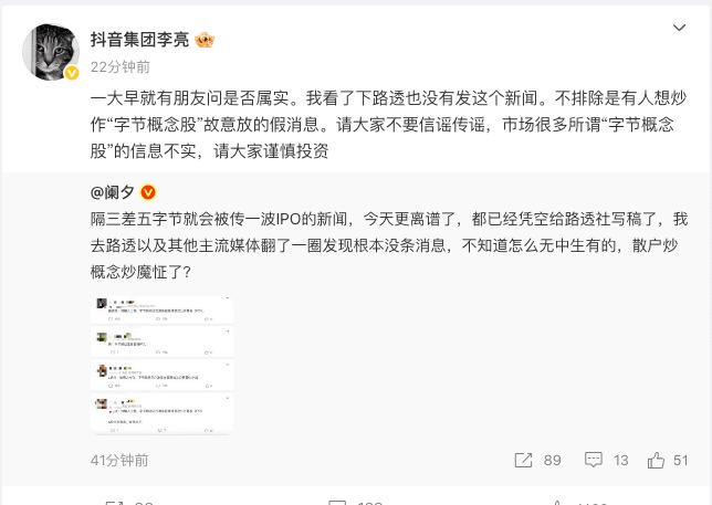 抖音集团副总裁李亮发文回应称:一大早就有朋友问,不排除有人想炒作“字节概念股”而故意放的假消息。请大家不要信谣传谣,市场很多所谓“字节概念股”的信息不实,请大家谨慎投资。