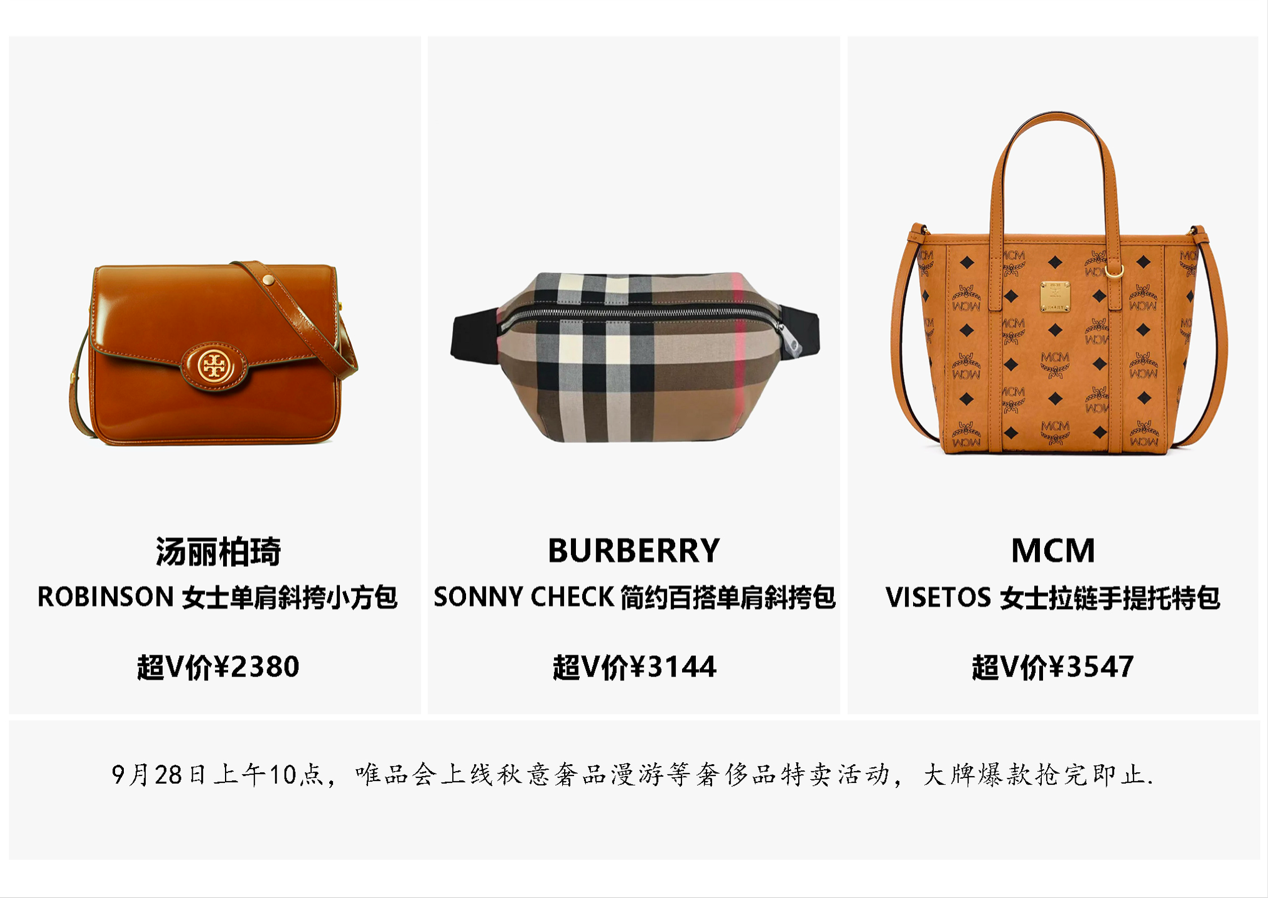 据了解,国庆长假前,电商平台也把目光瞄准了奢侈品特卖,9月28日,唯品会上线秋意奢品漫游等奢侈品特卖活动,原价近两万的Burberry中号水桶包折扣价仅需3500元左右。另一款汤丽柏琦的ROBINSON系列单肩小方包,原价近5000元,折扣价仅为2400元左右。其平台数据显示,9月中旬以来, Burberry、Coach、汤丽柏琦等知名大牌销量快速增长。
