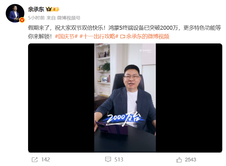 9月29日上午,华为常务董事、终端BG董事长余承东在社交平台表示,鸿蒙5终端设备从0到1000万台用了10个月时间,而此次从1000万到2000万只用了2个月时间。