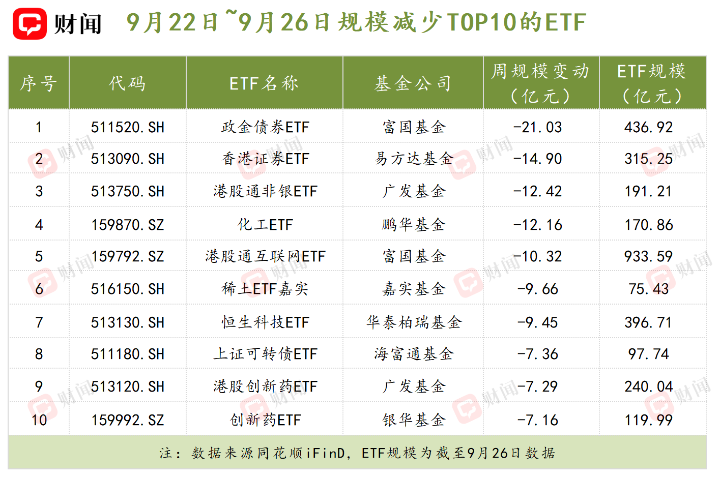 例如香港证券ETF,同花顺iFinD数据显示,自6月第三周(6月16日~6月22日)以来,该ETF已经连续15周获得资金净流入,但是上周这一纪录被打破,加上该ETF跟踪的中证香港证券投资主题指数上周表现不佳,该ETF规模上周缩水14.9亿元。