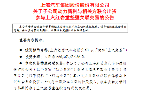 9月30日,上汽集团(600104)公告,公司子公司动力新科(600841.SH)拟与公司控股股东上汽总公司等相关方共同组成联合体参与上汽红岩重整投资。动力新科投资金额6.66亿元,预计取得重整后上汽红岩14.66%目标股权。