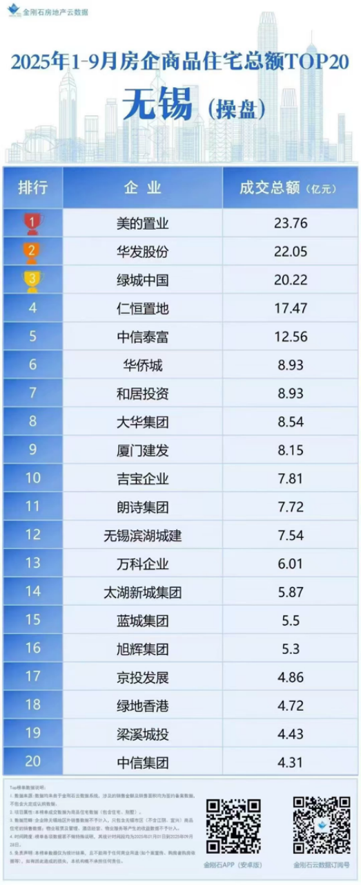 金刚石云数据公布2025年1-9月无锡房企商品住宅操盘销售总额排行榜,美的置业凭借东望府、云璟、云开东方、山水拾涧等诸多项目去化优势,以23.76亿元排名第一。