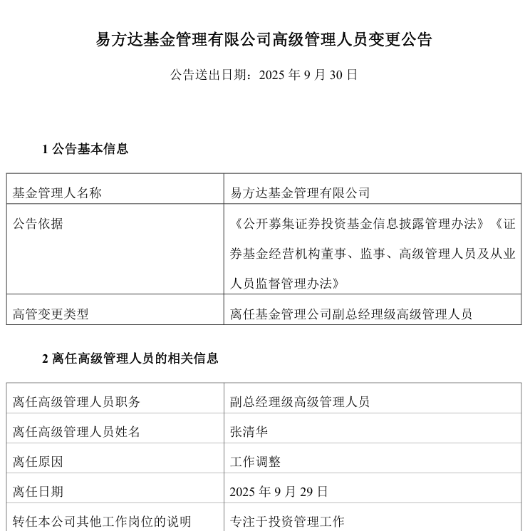 日前,易方达基金发布公告,张清华离任副总经理级高级管理人员,专注于投资管理工作。