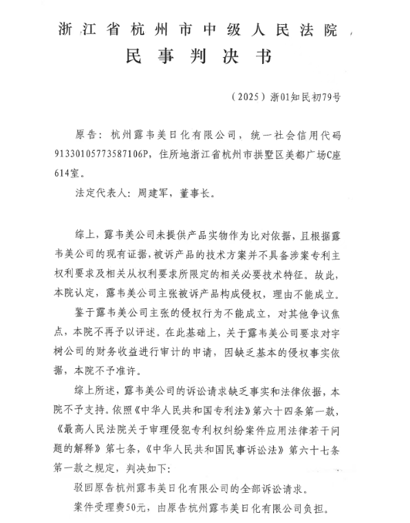 法院在一审判决书中表示,露韦美公司未提供产品实物作为比对依据,且根据露韦美公司的现有证据,被诉产品的技术方案并不具备涉案专利主权利要求及相关从权利要求所限定的相关必要技术特征。法院认定,露韦美公司主张被诉产品构成侵权,理由不能成立。